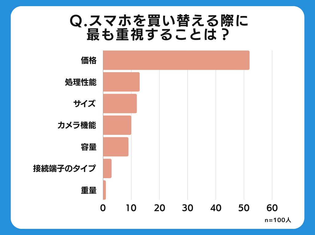一方で「スマホを買い替える際にもっとも重視すること」では、「価格」52人が「処理性能」13人を大きく上回っている。物理的な不具合や不満で新機種を買うにしても、性能よりも価格が重視されていることがわかる。