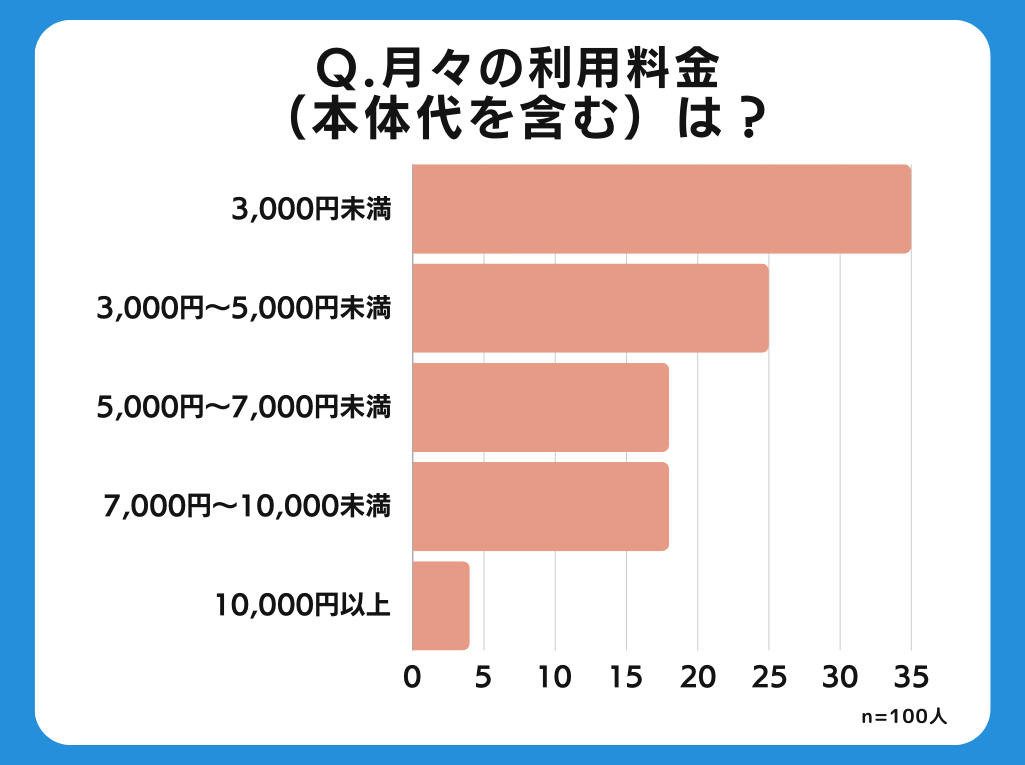 「月々の利用料金(本体代を含む)」は、「3,000円未満」35人が多数派で、「3,000円~5,000円未満」25人がそれに続いた。
