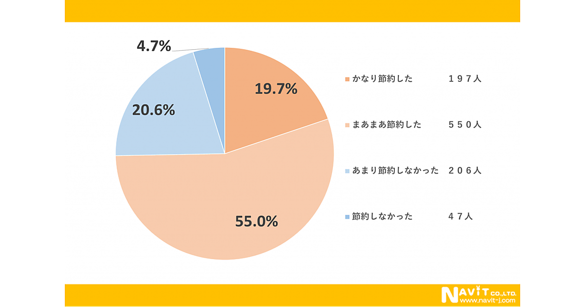まず「この1年、生活費の節約をしましたか?」と聞くと、「かなり節約した」19.7%、「まあまあ節約をした」55.0%で、4人に3人が節約を心掛けていた。
