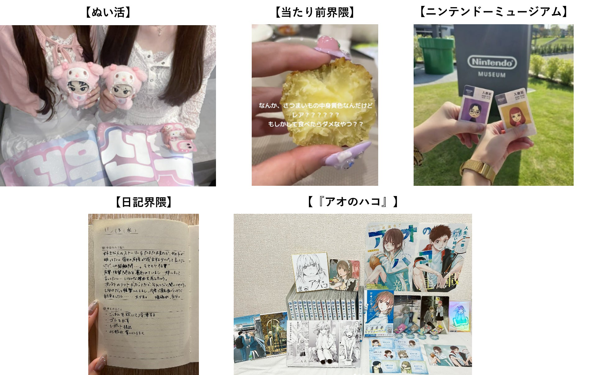 モノ・コト部門では、推しのぬいぐるみと一緒にお出かけしたり、写真を撮ったりする「ぬい活」が引き続きブームに。TikTokを中心に大喜利ミームが流行っている「当たり前界隈」、手書きの日記を共有する「日記界隈」などの界隈化も加速している。
