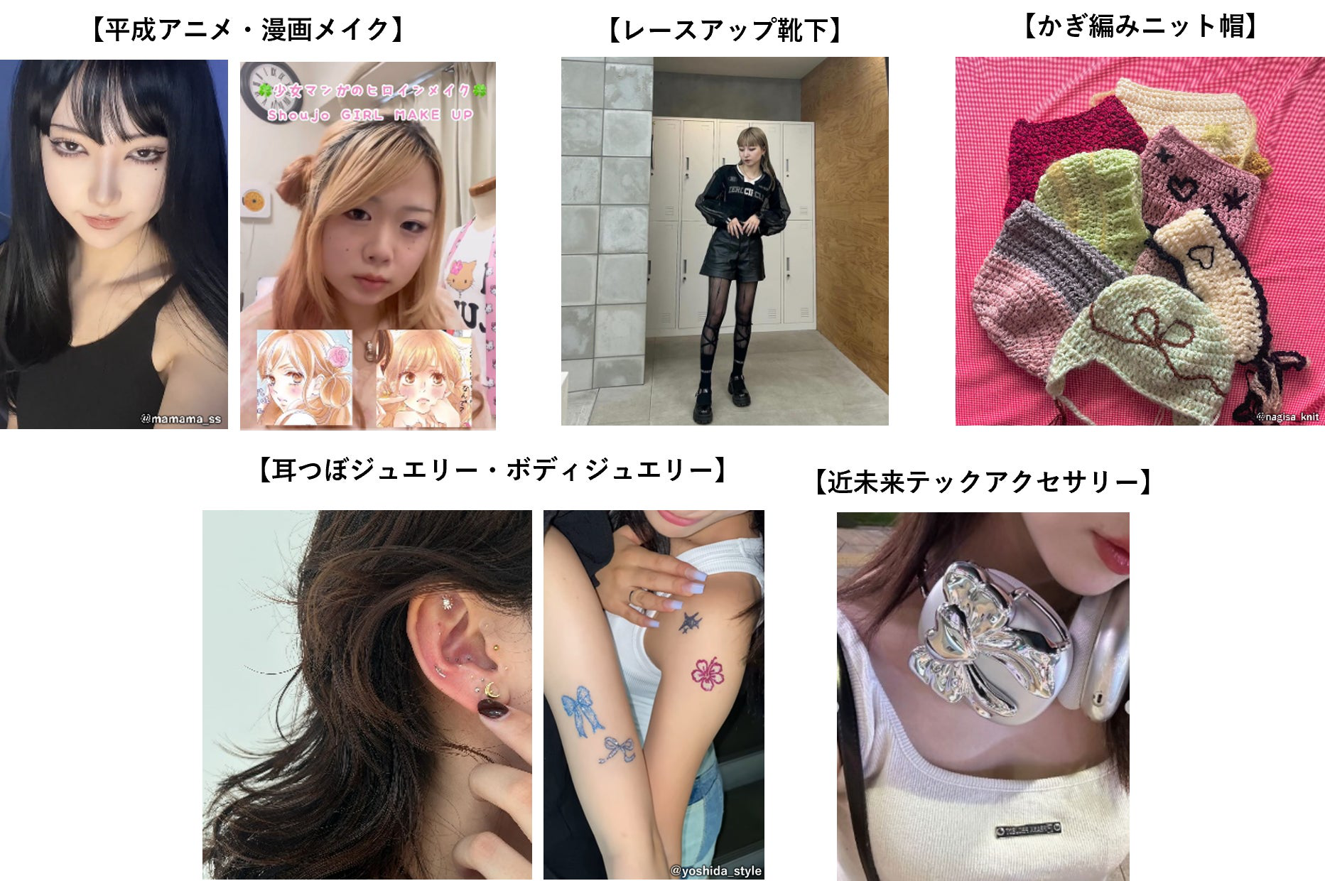 ファッション・メイクでは、平成レトロ的なY2Kや近未来的なY3Kに引き続き注目が集まっている。簡単にバレエコア要素を取り入れられる「レースアップ靴下」や、手作りの「かぎ編みニット帽」、耳にシールを貼ってつぼを刺激する「耳つぼジュエリー」なども人気になりそうだ。