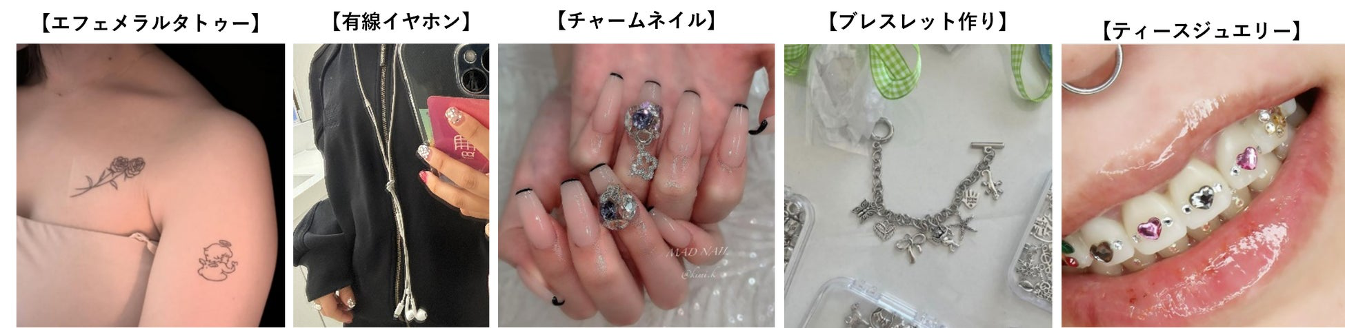 さらに、無線イヤホンが主流である若者にとってはオシャレに見えるのが「有線イヤホン」。特に古着系ファッションにおいて、ネクタイのように首から垂らすなどが楽しまれている。また、爪に揺れるパーツをつける「チャームネイル」、歯の表面にクリスタルなどをつける「ティースジュエリー」など、キラキラ・ジャラジャラしたコーデに関心が高まっている。