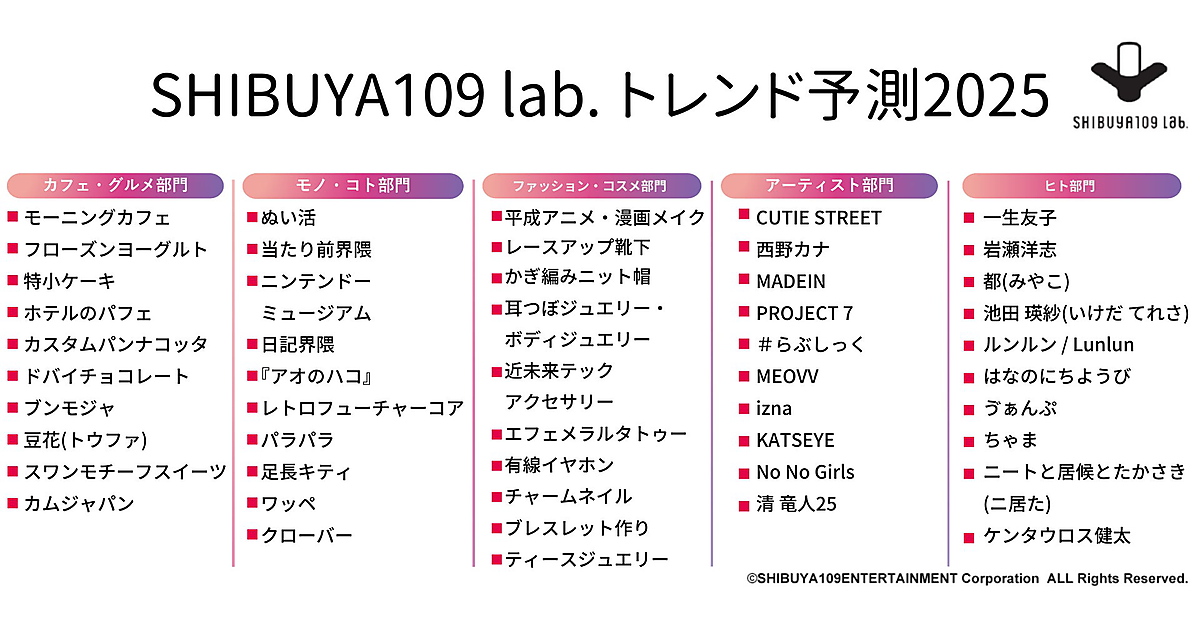 SHIBUYA109エンタテイメントが運営するSHIBUYA109 lab.は、「2025年のトレンド予測」を発表した。独自ネットワーク「SHIBUYA109 lab. MATE」に所属する、around20(15~24歳)の女性469名を対象に調査している。