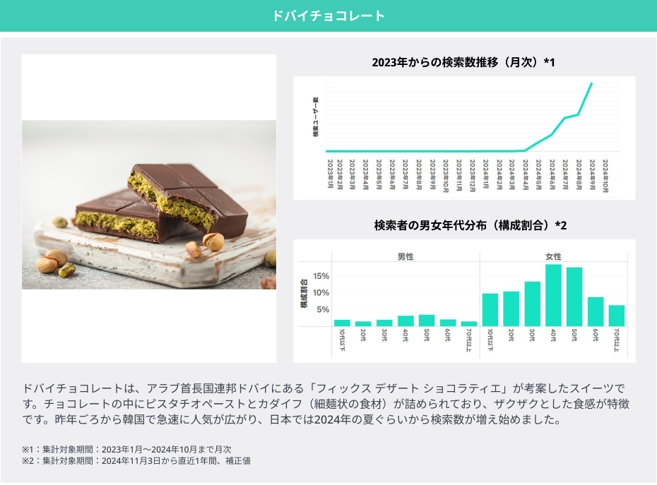 ドバイの「フィックス デザート ショコラティエ」が考案したスイーツである「ドバイチョコレート」。中にピスタチオペーストとカダイフ(細麺状の食材)が詰められたチョコレートで、主に韓国で人気が急上昇している。