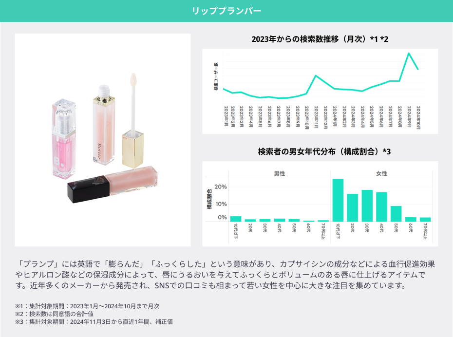 「リッププランパー」とは、唇にうるおいを与えてふっくらとボリューミーに仕上げるアイテムで、近年はデパコス、プチプラともに多くのメーカーから発売されている。カプサイシンの成分などで唇をぴりっとさせ、血行を促進させる作用がある。