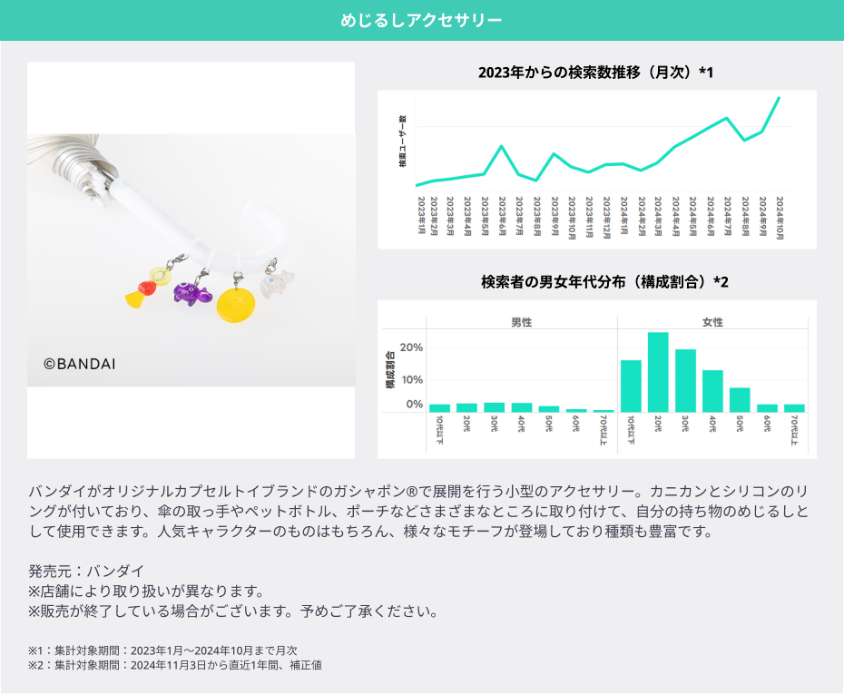 「めじるしアクセサリー」とは、バンダイがオリジナルカプセルトイブランドのガシャポン※で展開している小型のアクセサリー。カニカンとシリコンのリングが付いており、傘の取っ手やペットボトルなどにつけて、自分の物だとわかるよう目印にする。