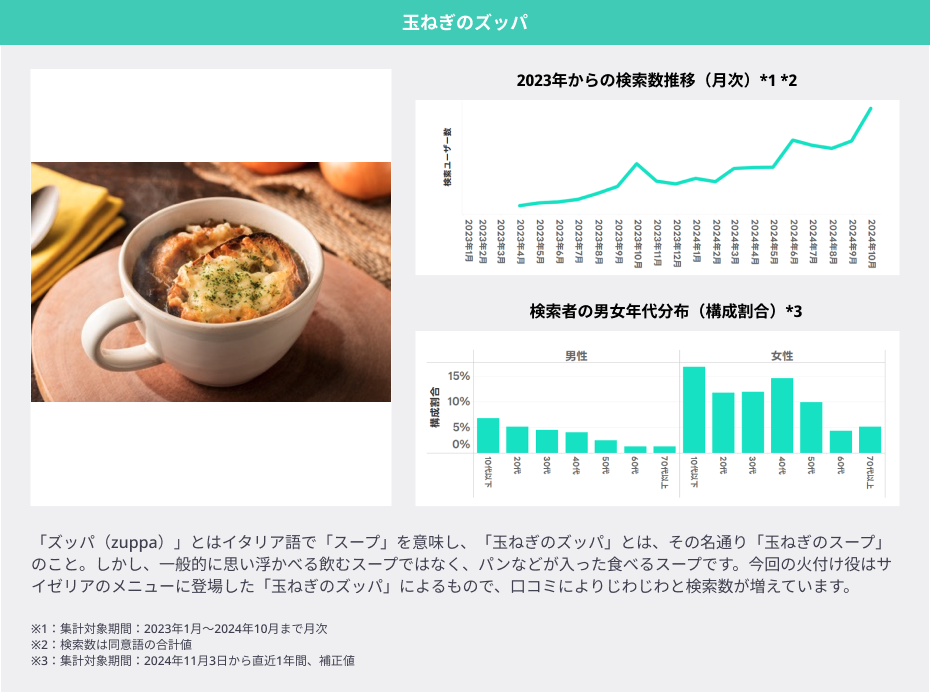 「玉ねぎのズッパ」とは、その名通り「玉ねぎのスープ」のこと。「ズッパ(zuppa)」とはイタリア語で「スープ」を意味する。パンなどの具材が入った「食べるスープ」で、サイゼリアのメニューに登場したことで話題となった。
