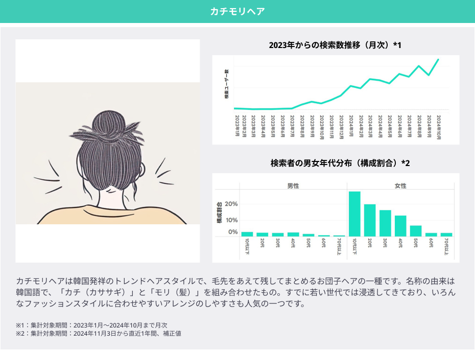 「カチモリヘア」とは韓国発祥のヘアスタイルで、毛先をあえて残してまとめるお団子ヘアの一種。韓国語で「カチ(カササギ)」と「モリ(髪)」を組み合わせた言葉が由来となっている。
