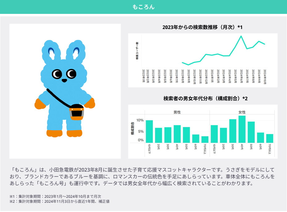 小田急電鉄が2023年8月に誕生させた子育て応援マスコットキャラクターである「もころん」。ブランドカラーであるブルーを基調に、ロマンスカーの伝統色を手足にあしらっており、もころん柄に全面ラッピングを施された「もころん号」も運行中。