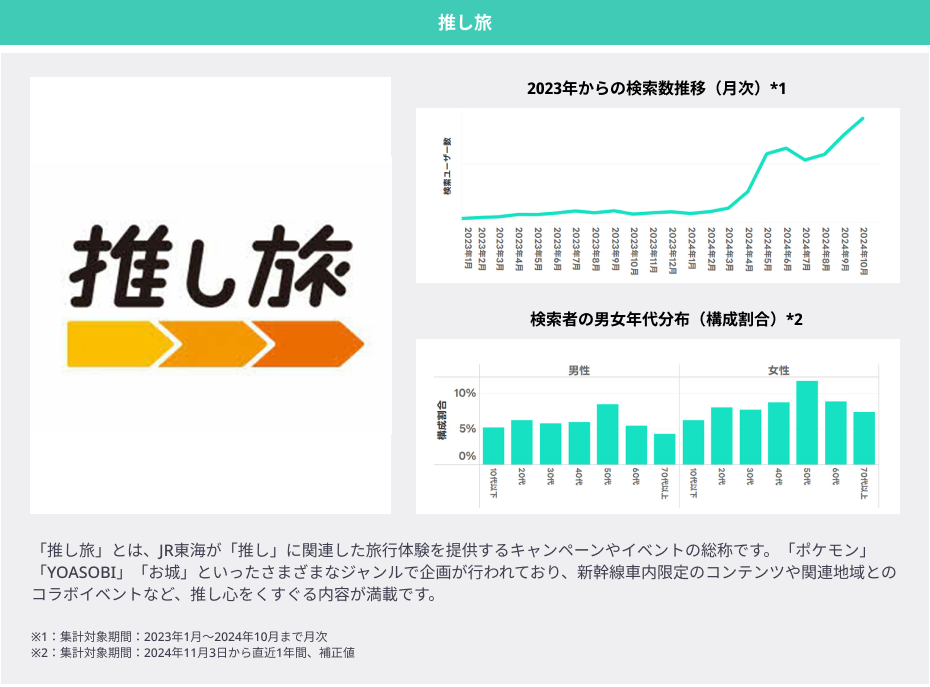 「推し旅」とは、JR東海による「推し」関連の旅行キャンペーンやイベントの総称。「ポケモン」「YOASOBI」「お城」など、すでにさまざまなジャンルで企画が行われており、新幹線車内限定のコンテンツや関連地域とのコラボイベントも存在する。