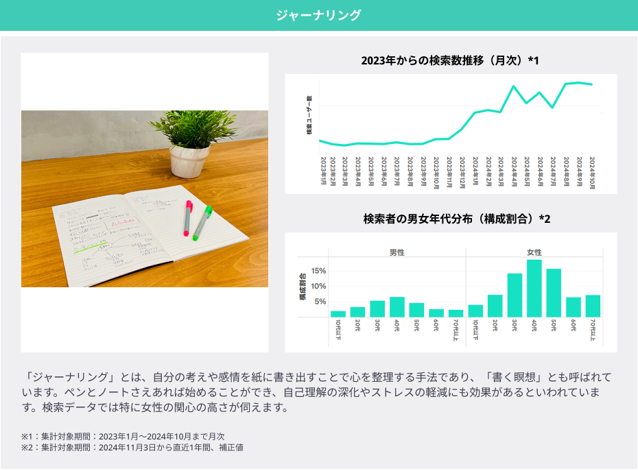 「ジャーナリング」とは、自分の考えや感情を紙に書き出すことで心を整理する手法のこと。自己理解の深化やストレスの軽減にも効果があるとされ、特に女性の関心度が高い。