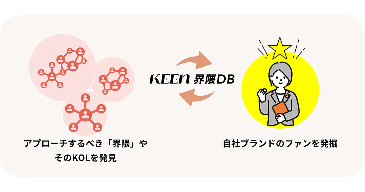 ユーザーコミュニティ支援事業を展開するKEENは、特定の趣味や関心事を軸にSNSでの交流で形成されるゆるやかなつながりの「界隈」と、その中心人物(KOL)を可視化する消費財メーカー向け新サービス「KEEN界隈DB(データベース)」の提供を始めたと12月10日に発表した。多様化した消費者の興味関心を界隈の単位で捉え、界隈のトレンドに寄り添ったより効果的なマーケティング施策を目指す。