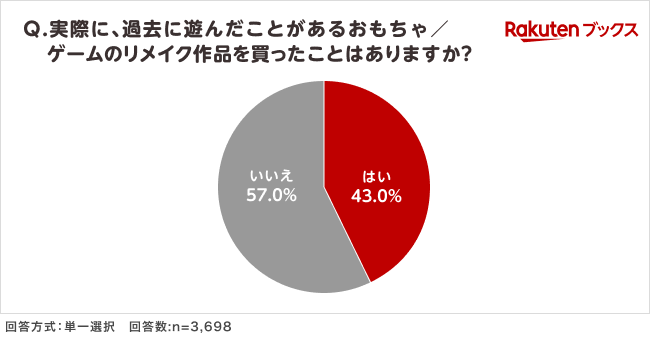 また、過去に遊んだことがあるおもちゃやゲームについて、リメイク作品を買ったことがあるかという質問では、43.0%が「はい」と答えた。