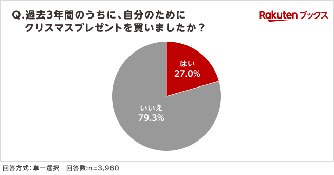 続いて、過去3年以内に自分へのクリスマスプレゼントを買ったことがあるかを聞いたところ、27.0%が「はい」と回答した。