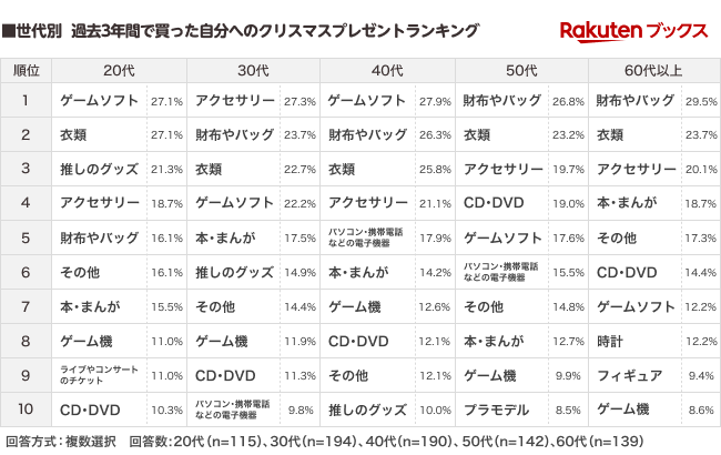 具体的にどんなプレゼントを買ったかを年代別で聞くと、全体では「ゲームソフト」や「財布やバッグ」「衣類」などが上位となり、男性では「パソコン・携帯電話などの電子機器」「ゲーム機」、女性では「財布やバッグ」「衣類」「推しのグッズ」などがランクインした。