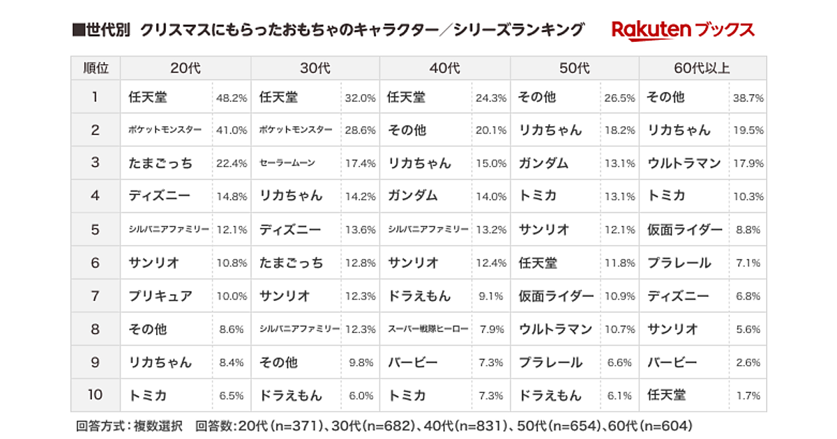 クリスマスにもらったおもちゃのキャラクター/シリーズとしては、20代から40代では「任天堂」が堂々の1位に。20代と30代では「ポケットモンスター」が2位、50代と60代以上では「リカちゃん」が2位に入り、男性では「ガンダム」が高順位となった。