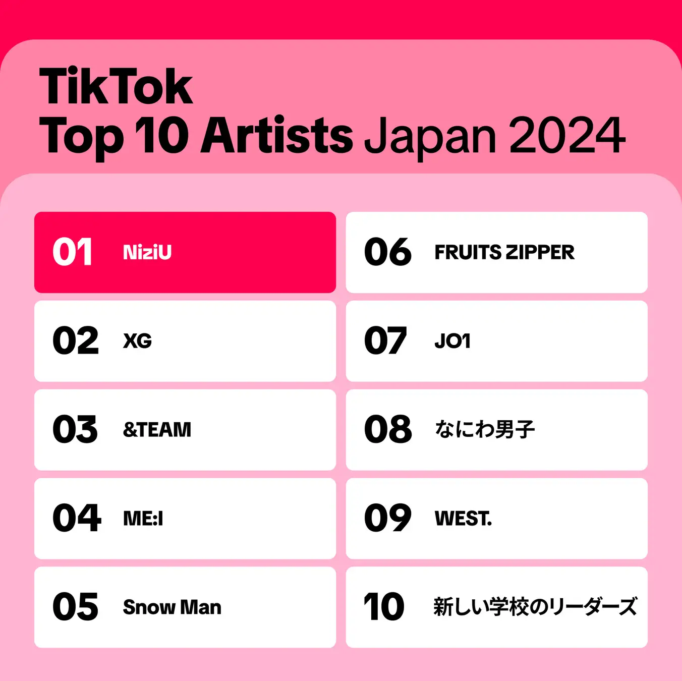 TikTokで流行ったアーティストランキングでは、オーディション番組「Nizi Project」(通称虹プロ)発の9人組のガールズグループ「NiziU(ニジュー)」が首位を獲得。2位は日本発のK-POP系ガールズグループ「XG(エックスジー)」、3位はBTSの後輩グループである「&TEAM(エンティーム)」となり、トップ10には日韓問わず多様なアイドルがランクインした。