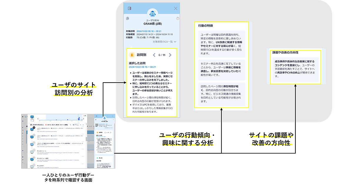 USERGRAMで計測している個別ユーザの行動データの解釈やインサイト(洞察)抽出を生成AIがサポートする。USERGRAMでオンライン・オフラインを横断したユーザ行動を時系列で可視化し、それらの行動データを生成AIが分析してユーザの行動の特徴・関心・課題を提示する。コンバージョン(顧客転換)に手間取ったユーザなど分析対象を絞り込んで活用すれば、より効率的なインサイトが得られる。25年上期中の正式リリースを目指す。
