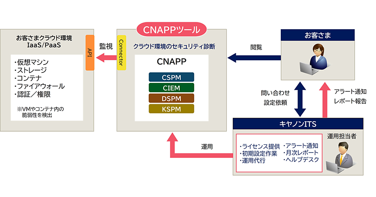 クラウドサービスの普及で企業の情報資産の保管場所はクラウド側に集約され、クラウドに対するサイバー攻撃も増加傾向にある。担当者の誤った設定で思わぬ情報漏えいを招くケースもある。このためクラウド環境下のセキュリティリスクを継続検知し、クラウド設定監査を行う「Cloud Native Application Protection Platform(CNAPP)」が注目されている。キヤノンITSは、継続サービスと単発で設定診断するプランを用意した。