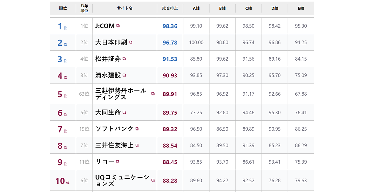 また、今年はサイトリニューアルにより、大幅に順位を上げた企業が目立つ結果に。「三越伊勢丹ホールディングス」は63位→5位、「コスモ石油」は93位→12位で50位以上のランクアップ、「三菱商事」では134位→19位で100位以上のランクアップが見られた。