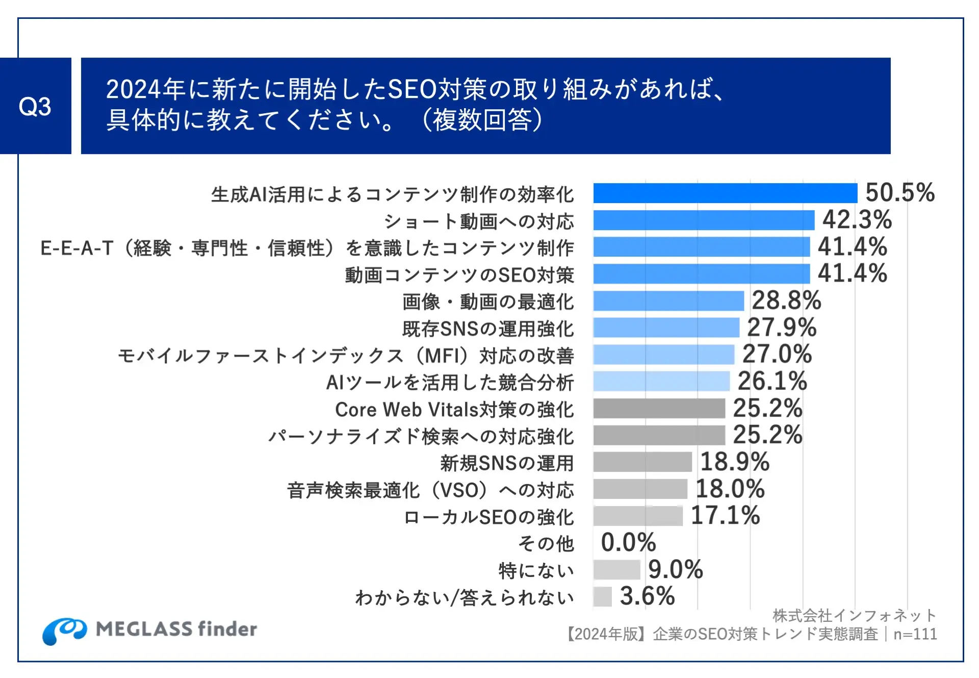 まず、2024年に新規で取り組んだSEO対策について聞くと、「生成AI活用によるコンテンツ制作の効率化」が50.5%で最も多く、ついで「ショート動画への対応」が42.3%と続いた。