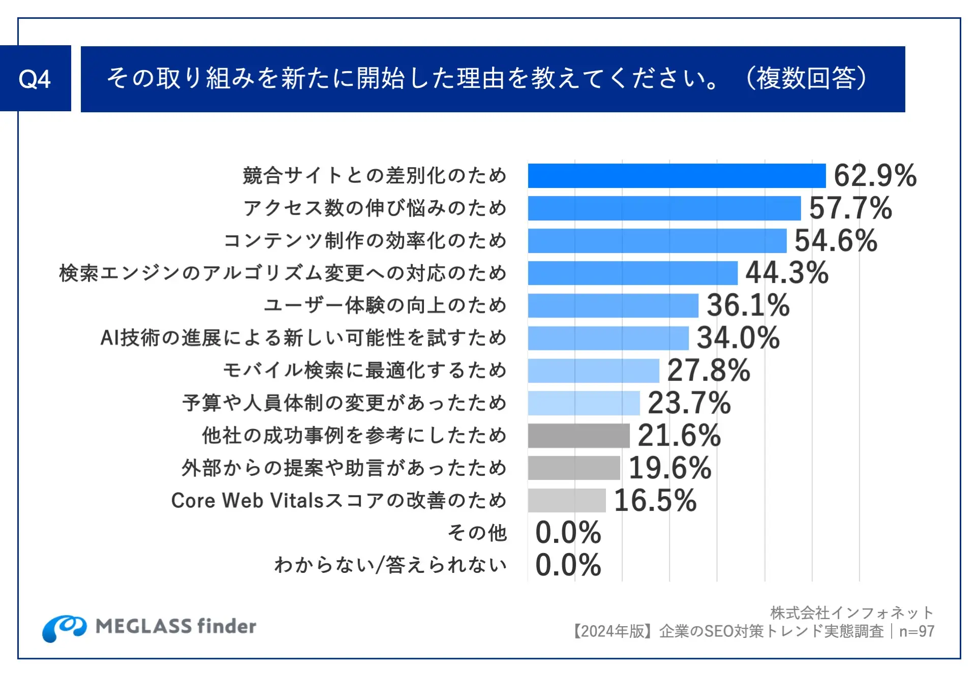 前項の取り組みを新たに実施した理由としては、「競合サイトとの差別化のため」が62.9%、「アクセス数の伸び悩みのため」が57.7%、「コンテンツ制作の効率化のため」が54.6%で上位となった。
