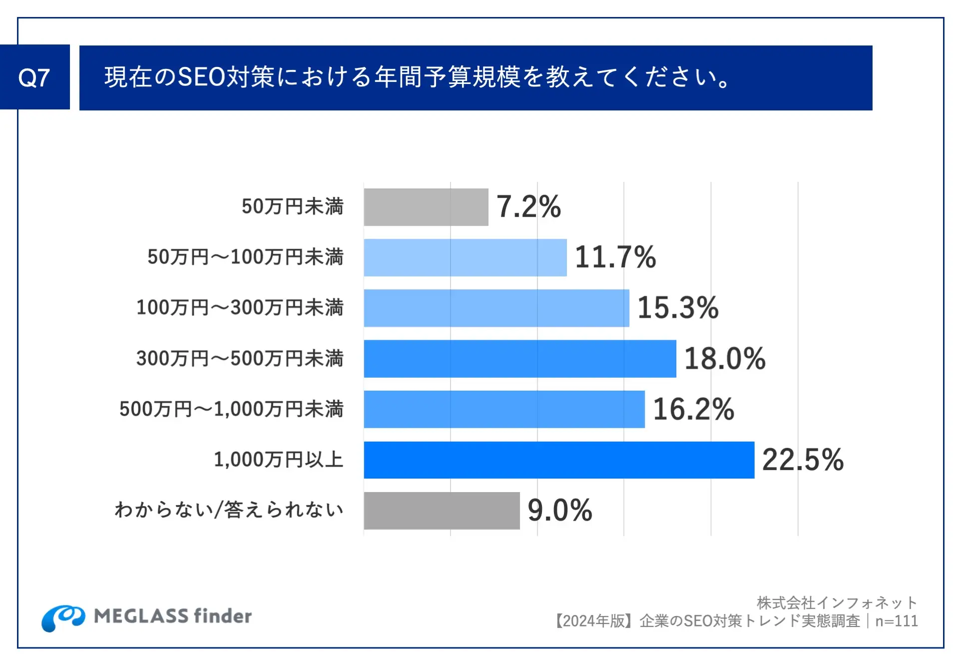 なお、現在のSEO対策における年間予算規模は「1,000万円以上」が22.5%で最多に。「100万円〜300万円未満」「300万円〜500万円未満」「500万円〜1,000万円未満」の層で比較的ばらけている結果となった。