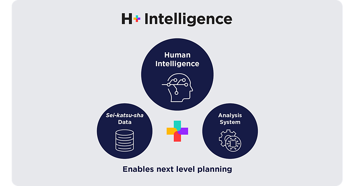 新たなH+Intelligenceは、博報堂のフィロソフィーの「生活者発想」をもとにしたプラニングをさらに高いレベルで推進する新たな仕組みと体制。匿名化した多種多様な生活者データにアクセスできる環境と体制を整備し、AI(人工知能)搭載の分析基盤も活用して生活者インサイトを国を横断して描き出す。ブランドのアセットやWeb情報からAIの力でブランドの特徴を浮き彫りにし、SNS投稿から生活者の感情や深層的な文脈を解析する。