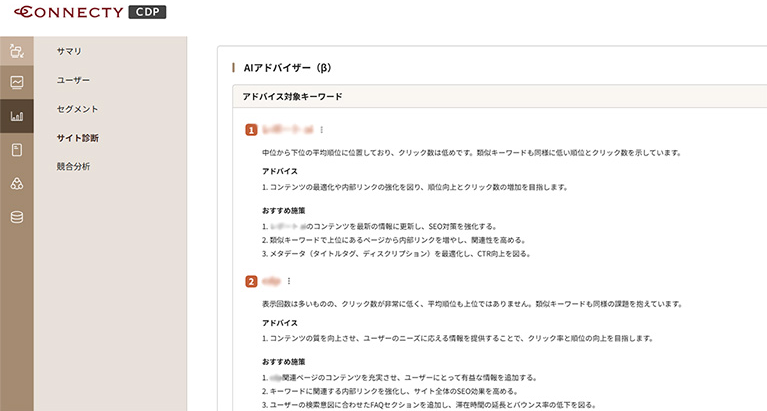 ①は、企業が強化したいキーワードに対して最適な戦略を提案し、マーケティング効果を大幅に高める。②は、ニーズに応じて柔軟なキーワード戦略が立案可能。強化したいキーワードとアドバイス対象から外したいキーワードが指定できる。③は、CONNECTY CDPのAIサイト診断画面でSEO改善が分かり、別のSEOツール不要で対策が必要な点を特定する。