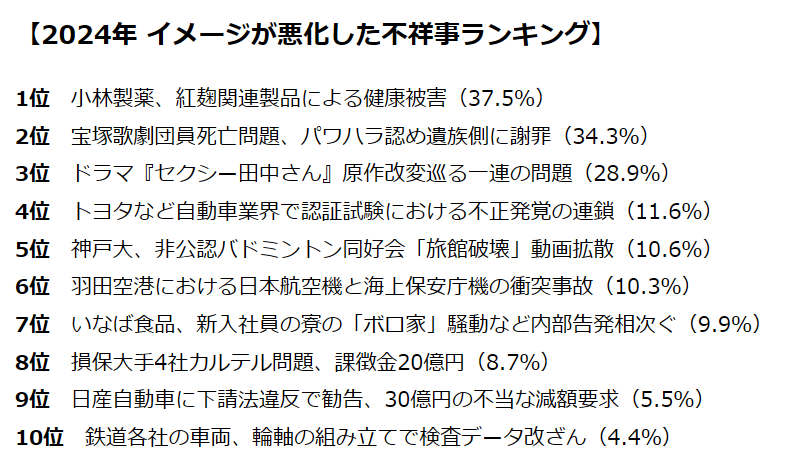 1位の小林製薬に対しては、「死者が何人も出ているのに原因究明が遅かったしトップの謝罪も誠意が感じられなかった」「健康被害をすぐに報告しなかったのが隠蔽体質な企業だと感じた」といった厳しい意見が相次いだ。2位の宝塚歌劇団には「劇団側のコメントが二転三転して、劇団のイメージがさらに悪くなった」、3位のドラマ『セクシー田中さん』原作改変問題には「全く説明責任が果たせておらず、うやむや」といった声があり、全般的に“企業の隠蔽体質”“危機管理意識の無さ”が指摘されている。