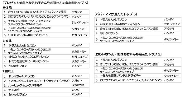 特にAIで子供の傾向を学習するという「ドラえもんAIパソコン/22,000円/バンダイ」は人気が高く、「3-6歳」「7歳以上」に贈るプレゼント、パパママが選んだプレゼント、祖父祖母が選んだプレゼントのいずれでも、1位となっている。