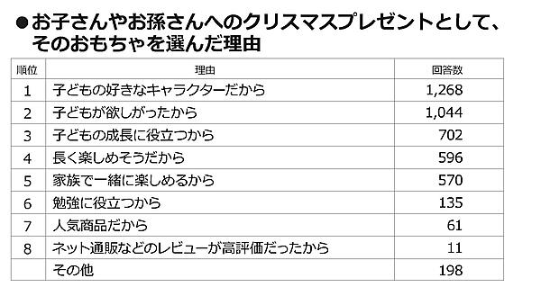 なお「お子さんやお孫さんへのクリスマスプレゼントとして、そのおもちゃを選んだ理由」では、「子どもの好きなキャラクターだから」が1位で、「子どもが欲しがったから」「子どもの成長に役立つから」「長く楽しめそうだから」がそれに続いた。