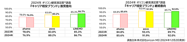 オリコン(oricon ME)は、2024年 満足度の高い「携帯キャリア」「キャリア格安ブランド」に関する調査結果を発表した。