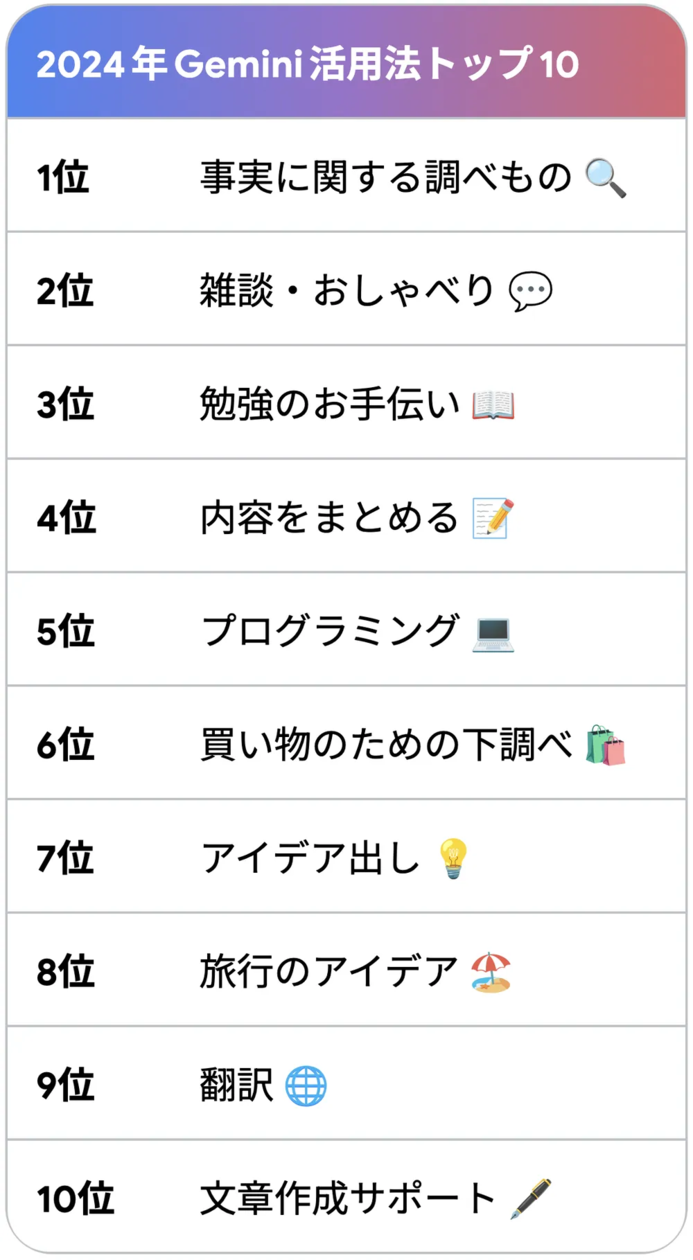 調査によると、Gemini活用法1位は「事実に関する調べもの」だった。物事を理解するための情報収集や、単一・複数の明確な答えを探す調べ方などでよく利用されている。2位には「雑談・おしゃべり」が昨年の6位から順位を上げてランクイン。10月に日本語版が公開された新機能「Gemini Live」では、音声で気軽に会話が楽しめるようになった。