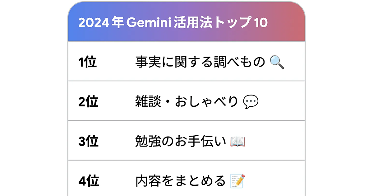 Googleは、2024年のGemini活用法トップ10を発表した。ユーザーがGeminiを日常でどのように活用しているかについて、具体的な例とともに紹介している。