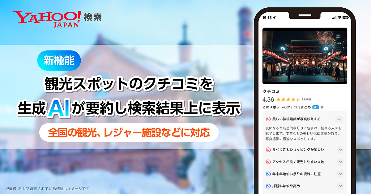 LINEヤフーは、同社が展開する検索サービス「Yahoo!検索」で、生成AI(人工知能)が観光スポットのクチコミを要約して検索結果上に表示する機能の提供を始めた、と12月19日発表した。全国の観光地やレジャー施設に対応。ユーザーが観光スポット名を検索すると、生成AIが抽出したクチコミのまとめが表示される。