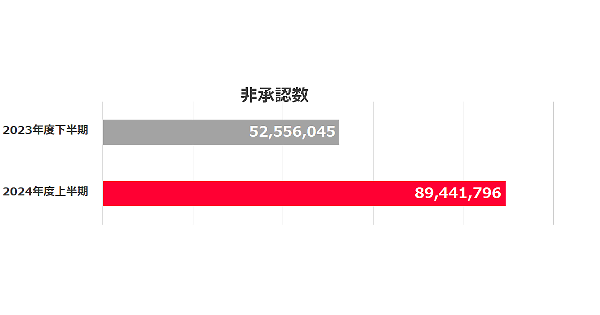Yahoo!広告では、2024年度上半期に約8,900万件の広告素材を非承認としており、前期から大幅に増加。要因としては、主に検索広告において、URLの文字列の誤りにより適切に表示されないサイトの入稿などの「ユーザーの意に反する広告の禁止」を行ったことが挙げられる。
