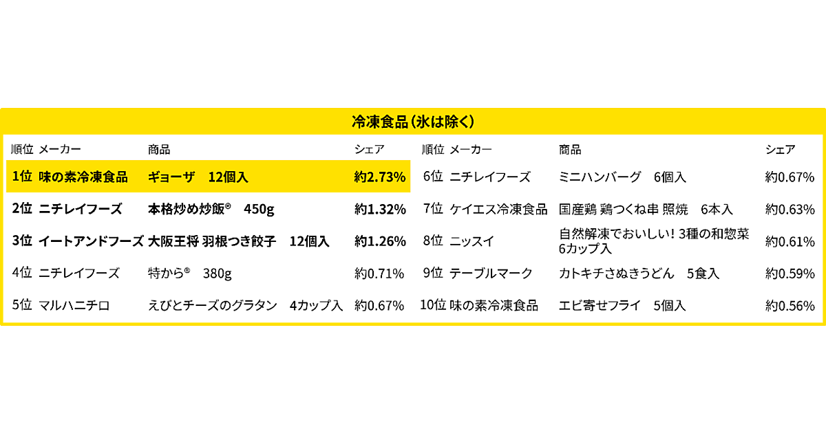 まず、冷凍食品では味の素冷凍食品の「ギョーザ」が1位を獲得。シェアは約2.73%で2位以下と大きな差をつけた。2位はニチレイフーズの「本格炒め炒飯」が続いている。また、お弁当のおかずとして重宝される「小さなおかず」が5位、6位、7位、8位、10位にランクインした。