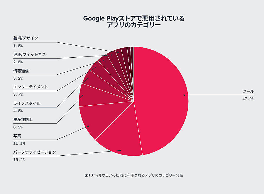 悪用されているアプリのカテゴリーとしては「ツール」47.9%が半数近くを占めており、「パーソナライゼーション」15.2%、「写真」11.1%、「生産性向上」6.9%がそれに続く。そのほか「エンタメ」「健康/フィットネス」「デザイン」なども悪用されており、幅広いジャンルのアプリに危険が潜んでいる状況だ。