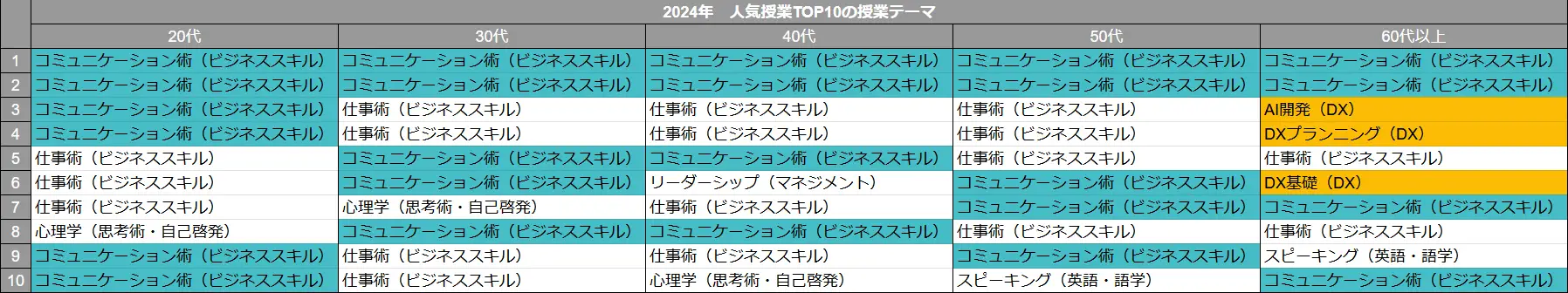 年代別にみると、2024年は「コミュニケーションスキル」への需要が全年代で高かったほか、「仕事術」も例年通りの人気に。特に20代では「コミュニケーション術」が目立った一方で、60代ではAI開発、DXプランニングなど「DX」のカテゴリが上位に複数ランクインした。ChatGPTなど生成AIの台頭を受け、新たにリスキリングを始める中高年層も多かったようだ。