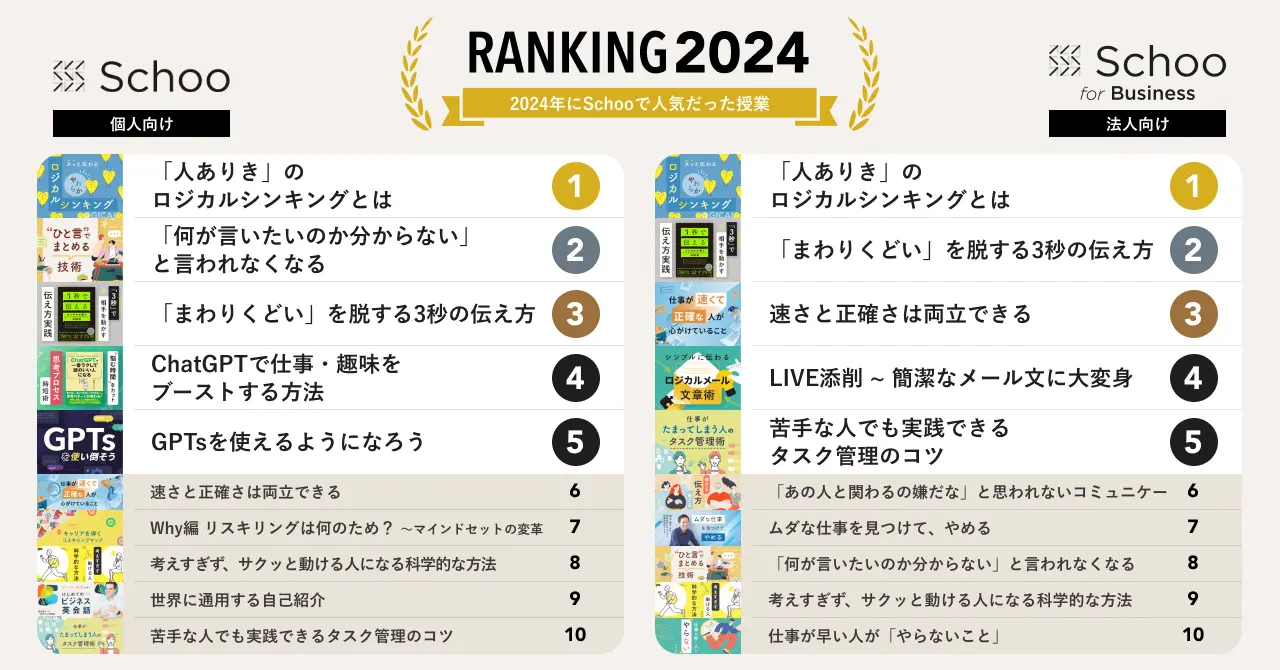 Schoo(スクー)は、社会人向けオンライン学習サービス「Schoo」の受講データをもとに、「Schoo人気授業ランキング 2024 〜個人・法人のリスキリングの変化と傾向〜」を発表した。
