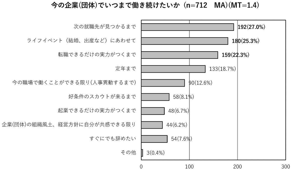 「今の企業(団体)でいつまで働き続けたいか」を聞くと、「次の就職先が見つかるまで」27.0%、「ライフイベント(結婚、出産など)にあわせて」25.3%、「転職できるだけの実力(スキル・キャリア・人脈)がつくまで」22.3%が上位で、転職・退職を前提としたプランが目立つ。一方前回1位だった「定年まで」は10.2ポイント減少して18.7%と、4位まで下がった。