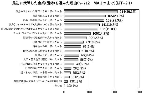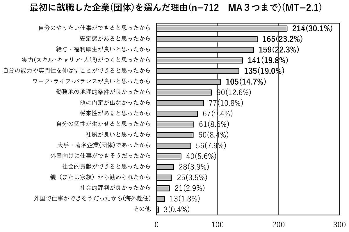 「最初に入社(職)した企業(団体)を選んだ理由」を聞くと、「自分のやりたい仕事ができると思ったから」30.1%が最多で、「安定感があると思ったから」23.2%、「給与・福利厚生が良いと思ったから」22.3%がトップ3だったが、いずれも前回調査から割合は減少している。