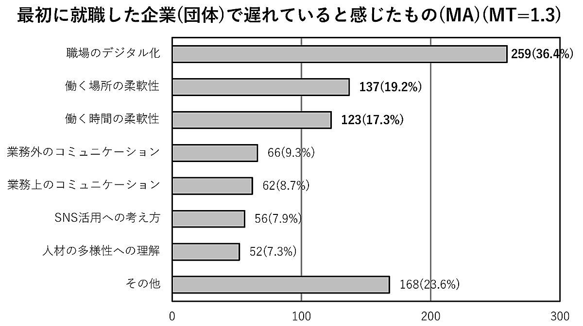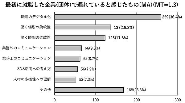 「最初に入社(職)した企業(団体)で遅れていると感じたもの」では、「職場のデジタル化」36.4%が特に多く、「働く場所の柔軟性(テレワークなど)」19.2%、「働く時間の柔軟性(フレックスタイムなど)」17.3%を大きく上回る。現在の若手社員は、デジタルネイティブのZ世代であるため、職場のITリテラシーにギャップを感じるようだ。