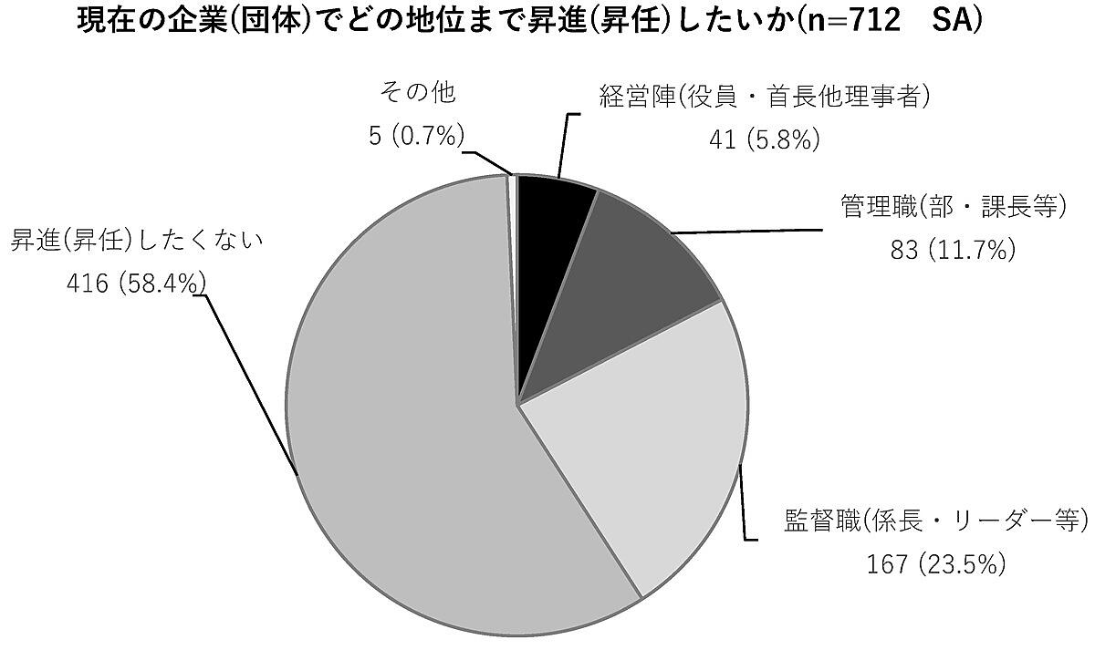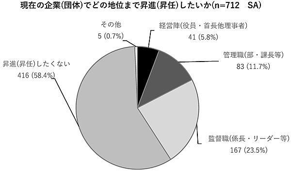 「現在勤務している企業(団体)で、どの役職まで昇進(昇任)したいか」を聞くと、「昇進(昇任)したくない」58.4%で、前回調査より15.8ポイント増加した。なお性別で見ると、女性は65.6%で全体より高い。