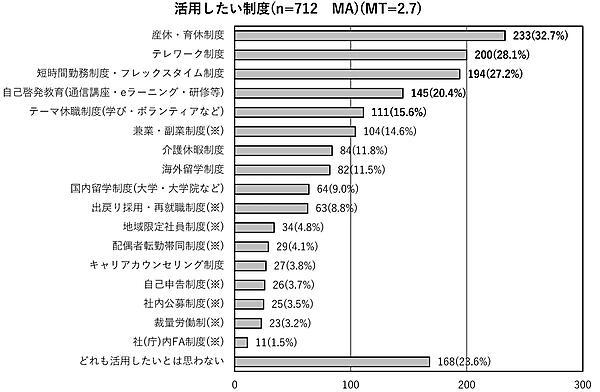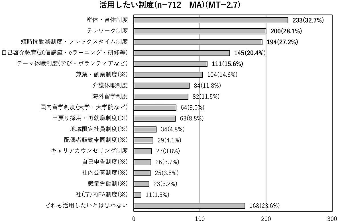 さらに「活用したい制度」については、1位は前回と同じ「産休・育休制度」32.7%だったが、前回7位の「テレワーク制度」28.1%が2位まで急上昇した。コロナの感染予防対策として、企業での導入が進んだことも大きな要因だろう。一方で「どれも活用したいとは思わない」が前回より15.0ポイント増加して23.6%となっており、「テレワーク制度」を除いて全体的に活用したい比率が前回より低下している。企業の制度に頼らない、という考えが背景にあると推察される。