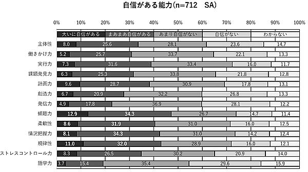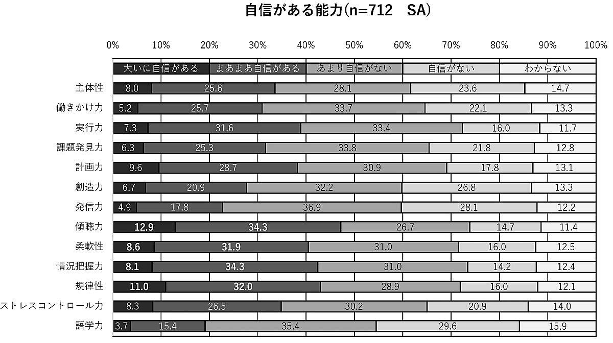 そして、経済産業省の提唱する「社会人基礎力」の12項目に「語学力」を加えた13の能力について、「どの程度自信があるか」を質問した。その結果、自信がある(おおいに自信がある+まあまあ自信がある)とした能力は、「傾聴力」「柔軟性」「状況把握力」「規律性」だった。いずれもチームで働く力で、フォロワーシップの高さがうかがえる。一方「働きかけ力」はやや少なく、自ら行動したり周囲に働きかけたりするのは不得意な人が多いようだ。なお自信がない項目は、「創造力」「発信力」「語学力」で前回調査と同じだった。