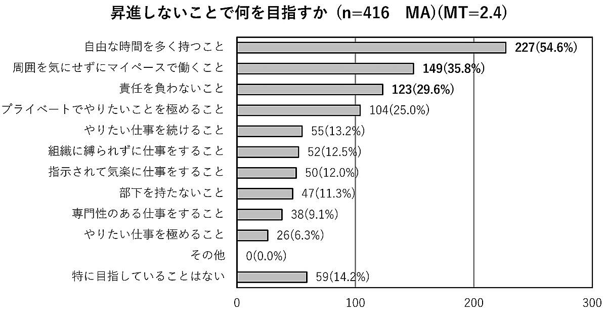 理由としては、「自由な時間を多く持つこと」54.6%が多く、「周囲を気にせずにマイペースで働くこと」35.8%、「責任を負わないこと」29.6%などが続いた。