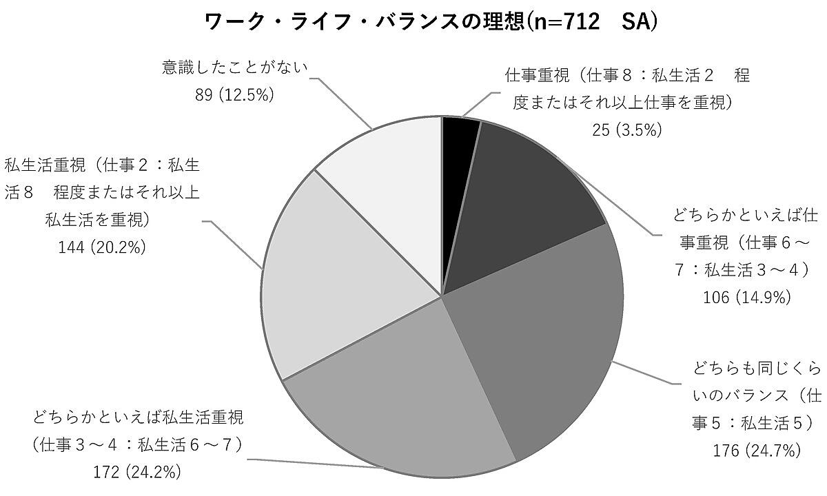 「ワーク・ライフ・バランス(仕事と私生活のバランス)の理想」を聞くと、「仕事重視(仕事8:私生活2程度またはそれ以上仕事を重視)」「どちらかといえば仕事重視(仕事6~7:私生活3~4)」の合計比率が18.4%だったのに対して、「私生活重視(仕事2:私生活8程度またはそれ以上私生活を重視)」「どちらかといえば私生活重視(仕事3~4:私生活6~7)」の合計比率は44.4%で、大きく上回る。なお「どちらも同じくらいのバランス(仕事5:私生活5)」は24.7%だった。