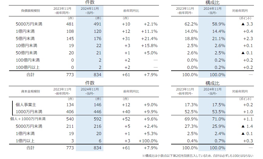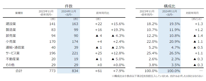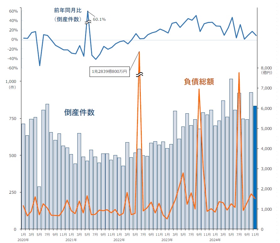 それによると11月の倒産件数は834件で、前年同月773件から7.9%増。31か月連続で前年同月を上回る状況が続いている。11月としては2013年(820件)以来の800件超えとなった。また2024年1~11月の累計では、9053件となっており、年間件数は12月の1か月分を残して2015年以降でもっとも多い。